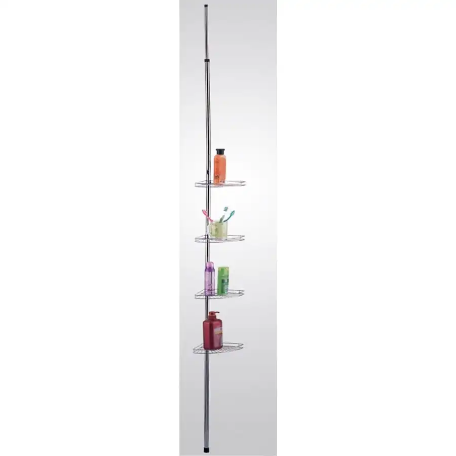 Corner bathroom stand, metal frame and shelves. The rack is tensioned between the floor and the ceiling. Min. 246 cm – max. 299 cm. Chrome plated. Color silver.