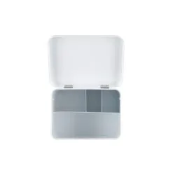 Metal medicine box for storing medicines and first aid supplies. The box has one larger compartment and three smaller ones. Keep the box out of the reach of children or pets.