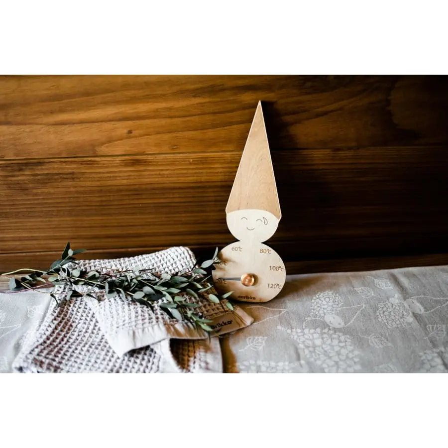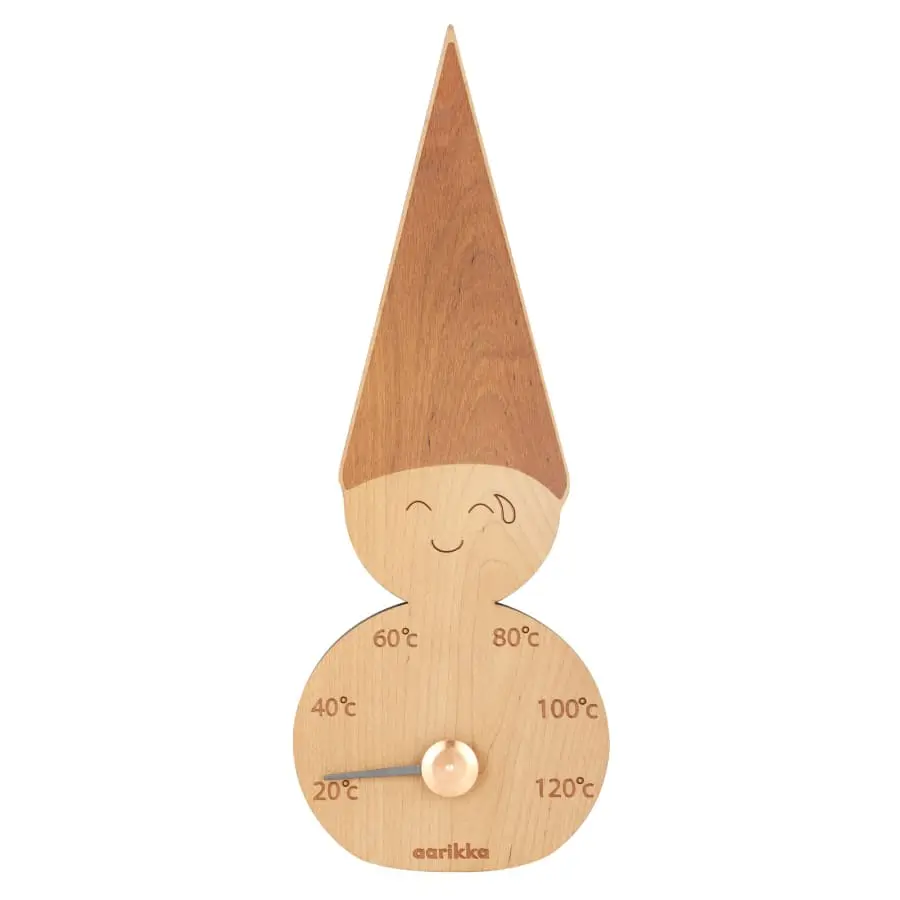 The Elf sauna thermometer is made of heat-treated wood and the pointer is metal. Measurements H 32,5 x W 12 cm.