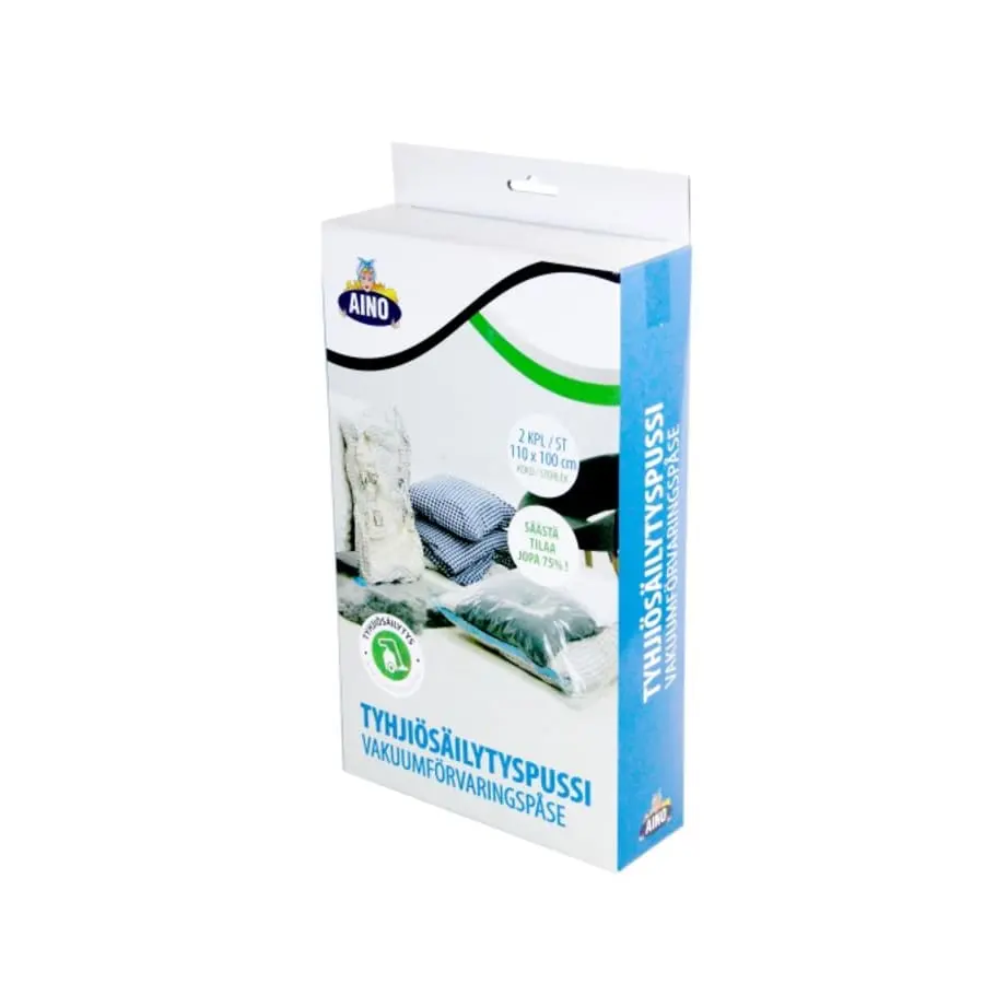 Aino Vacuum Storage Bag is airtight, watertight and reusable. Protects textiles from insects, smells and mold. This handy product allows storing clothes and other textiles by taking little space. Has a zip fastener. Saves space up to 75 %. The package contains two pieces of bags.