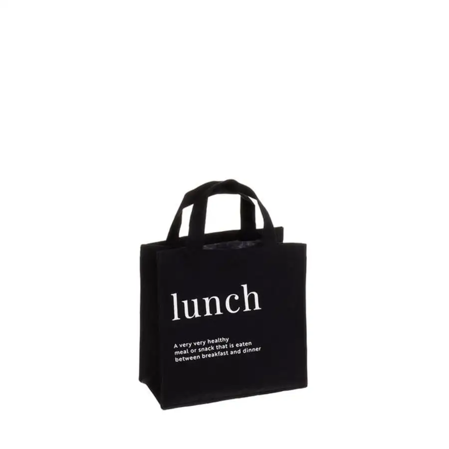 Stylish small canvas bag for lunch. Text on the side ”lunch – a very very healthy meal or snack that is eaten between breakfast and dinner”