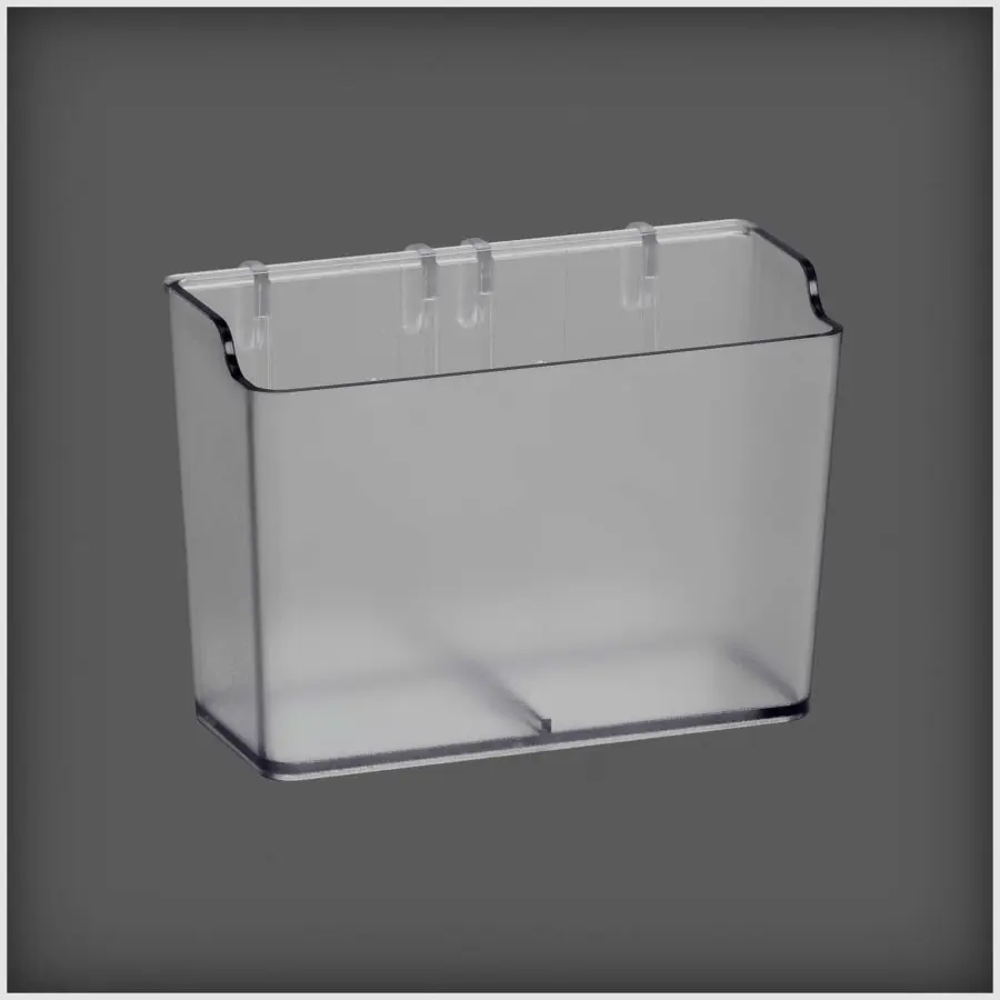 A frosted box for storing small items that can be attached to an Elfa storage board. Easy to attach. Width 112 mm, depth 60 mm, height 80 mm. Color frosted. Material plastic.