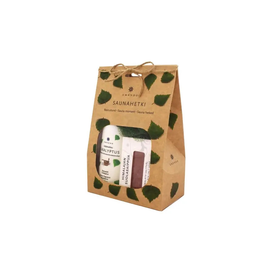 Emendon’s Sauna moment set contains Eucalyptus 250 ml sauna scent, green washing flower and Himalayan salt soap 240 g.