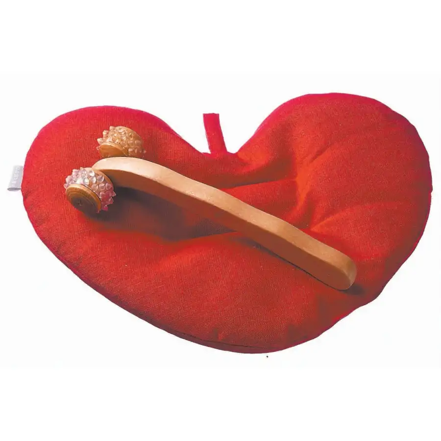 Heart-shaped wheat cushion and a massage roll. The warmed wheat cushion is an easy to use and natural help for tense shoulders and other muscles. Warm the wheat cushion a few minutes in the microwave or in the oven (place a half a cup of water in the microwave for the duration on the heating), place on the sore spot and relax. Can also be used cold.