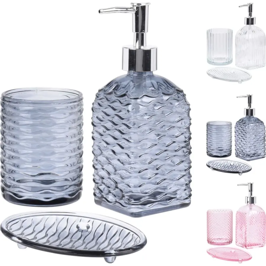 •Bathroom set. •Soap dispenser 400ml 20x20x7.5cm, toothbrush mug 7.8×7.8x10cm, soap cup 15x15x10cm •Colors, clear, gray and pink •Note! Assorted product, color cannot be selected when buying from the online store