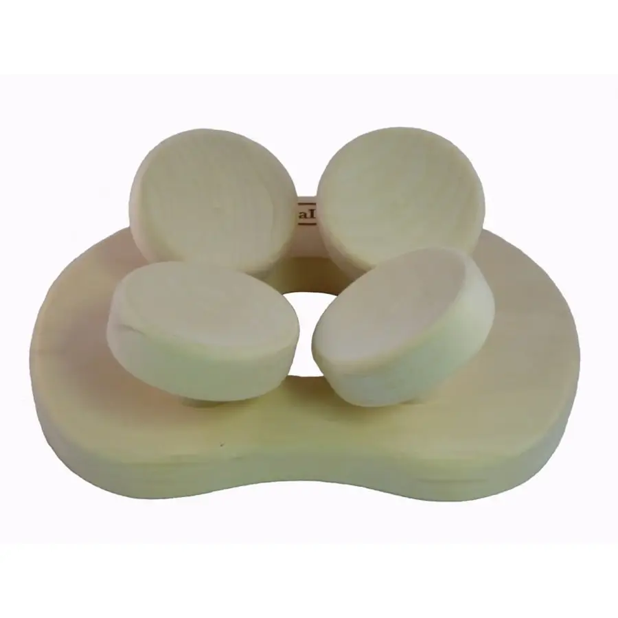HaLu saunatyynyn neljä nivelöityä puupalloa myötäilevät ja mukautuvat pään asentoon. Patentoitu saunatyyny tukee niska ja hartiaseutuavapauttaen niskalihasten jännitystiloja.