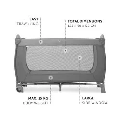 With the help of the castors, the Sleep N Play Go Plus can be moved effortlessly. It can be set up or folded up in no time at all and can be stored in the bag to save space. You can either carry the folded bed or pull it behind you like a suitcase.