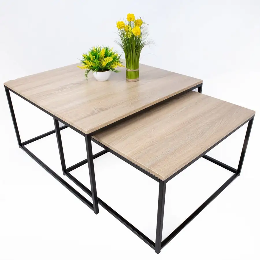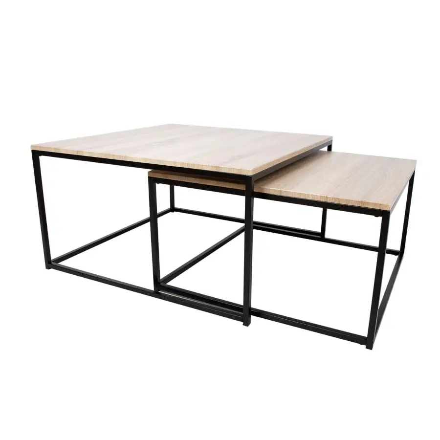 Coffee table ELT light brown. The stylish and convenient coffee table set consisting of two tables helps every day and also makes it easier to entertain guests at home. The table tops are made of oak-decorated laminate. The steel legs of the tables are coated with a matte black powder coating. The dimensions of the larger table are 75 x 75 x 40 cm and the smaller one 65 x 65 x 35 cm.
