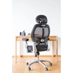 Adjustable office chair Gaiola. Synchronous mechanism, lockable in several positions, the stiffness of the swing can be adjusted based on the weight of the seat, the curvature of the backrest can be adjusted, the height of the seat can be adjusted with a gas spring. Armrests: material: plastic, padded polyester mesh fabric, height and distance adjustable. Neck support: height and inclination adjustable. Aluminum leg cross. Seat and backrest made of polyester mesh fabric.