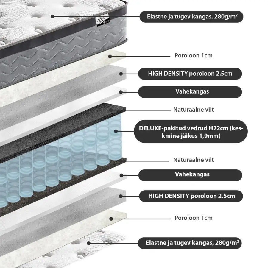 En resårmadrass som passar bra för normala och medelviktiga sovandes. Dubbelsidig, d.v.s. kan användas åt båda hållen. Påsfjädrad lyxficka (1,9 mm / 2,2 mm i kanten). Överdraget av stretchigt bomullstyg är hudvänligt och passar även personer med allergier. Madrassdynan är tillverkad av högkvalitativ profilerad skumplast, vilket säkerställer maximal avslappning av kroppen. Resårmadrassen är vadderad med två olika typer av polyuretanskum – den är slitstark och andas. Tyget, filten och vadden uppfyller den internationella Eco-Tex 100-standarden. Madrassen är packad på rulle och är därför lätt att transportera hem. Efter att förpackningen öppnats tar det cirka 2 timmar för madrassen att återgå till sin form.
