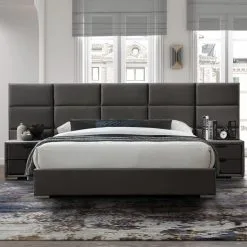 Levanter bed with beautiful gray velvet upholstery. The mattress is not included in the package. The frame of the bed is made of MDF board and the upholstery is made of velvety polyester fabric. Chromed metal legs. The end is included.