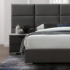 Levantersäng med vacker grå sammetsklädsel. Madrassen ingår inte i paketet. Sängens ram är gjord av MDF-skiva och klädseln är gjord av sammetslen polyesterväv. Kromade metallben. Slutet ingår.