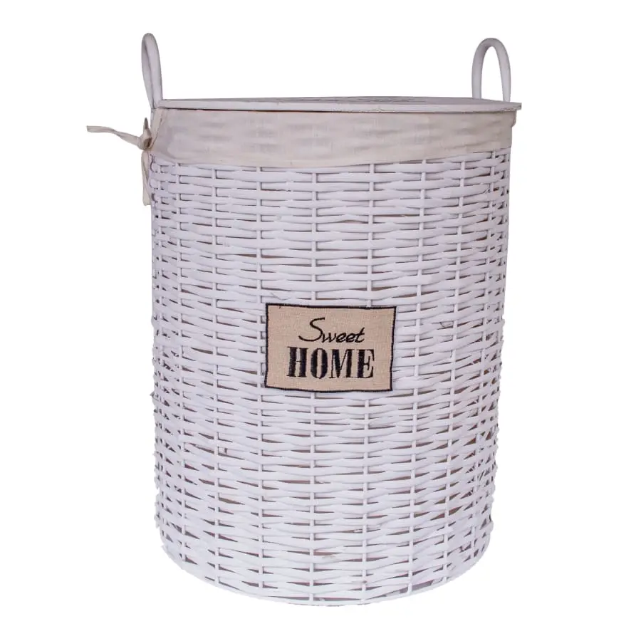 Tvättkorg med trälock MAX D38xH47cm, vävd, färg: vit, med tyg. Korgmaterial: färgad delad pil, tyg: vanligt tyg.