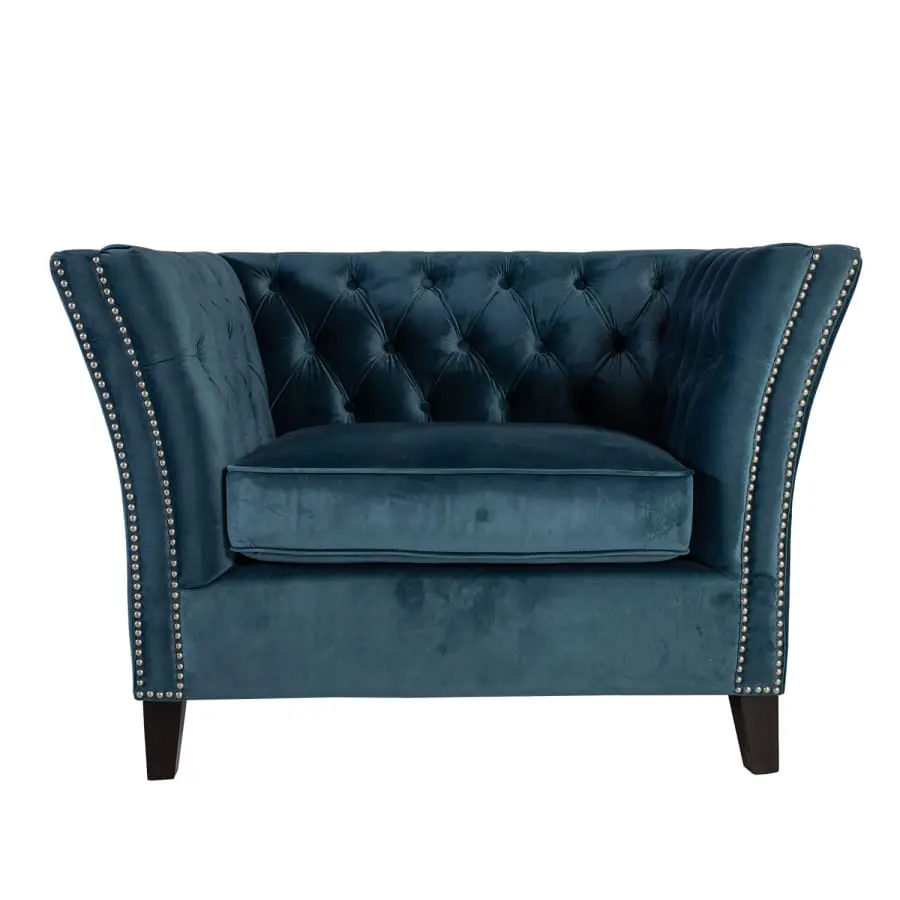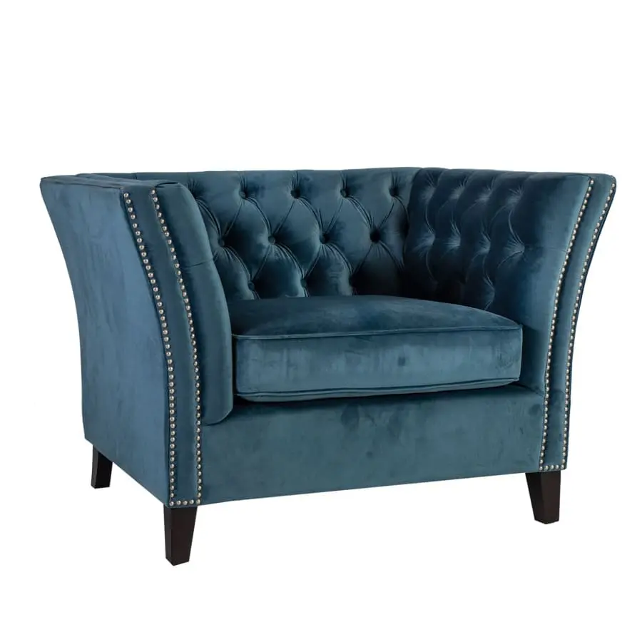 Stylish velvet armchair Mayers with beautiful decorative buttons. Wooden frame. Zig-zag and pocket suspension. Padding polyurethane foam 30kg/m³ and upholstery 100% polyester. Wooden legs.