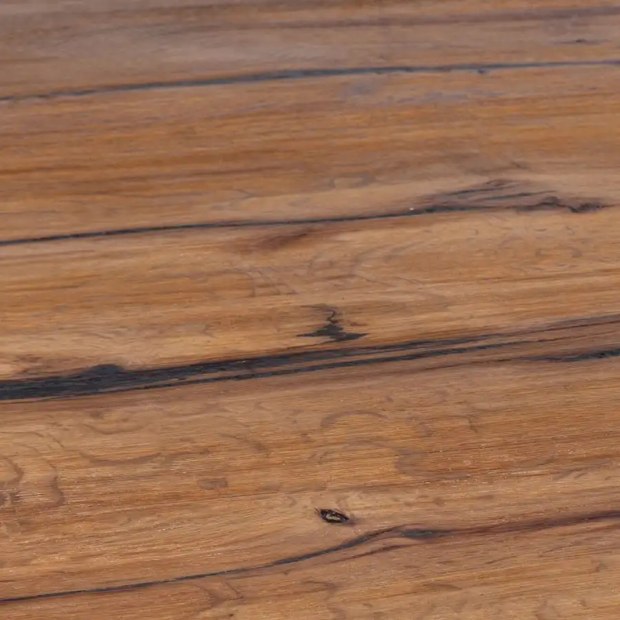 Stylish dark wood dining table Rotterdam. The tabletop is made of antique-colored oak veneered furniture board. Table legs and frame are metal. Solid wood slats on the edges of the table. The table is finished by oiling.