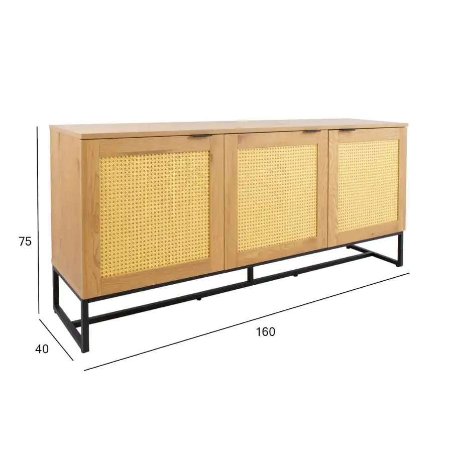Side table SAILOR 160x40xH75cm, melamine, oak decoration. The product is made of melamine-coated furniture board, which is stylishly complemented by rattan-like plastic panels. The base frame is made of metal and finished with black powder paint. The height of the metal frame is 18.5 cm. The side table has three quietly closing doors, one intermediate shelf behind each door. The doors have black metal handles.