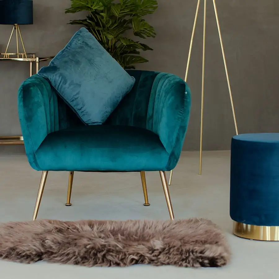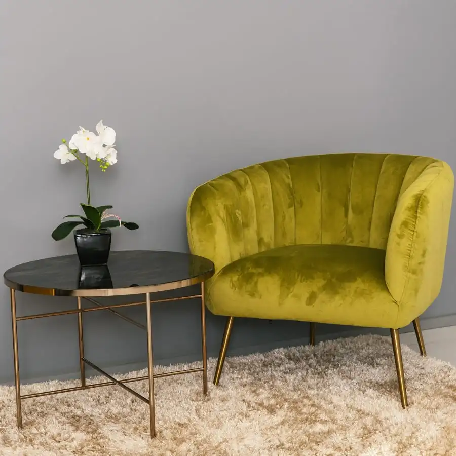 Tucker-fåtöljen är ett blickfång i ditt vardagsrum! En vackert designad, sammetslen fåtölj inbjuder dig att sitta ner. Fåtöljens utseende kompletteras av de vackra guldfärgade stålbenen.