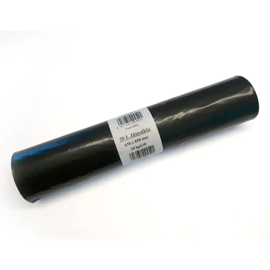 Black 50L garbage bag (20 pc/roll). Affordable but durable. Size of the bag: 650 x 850 mm.