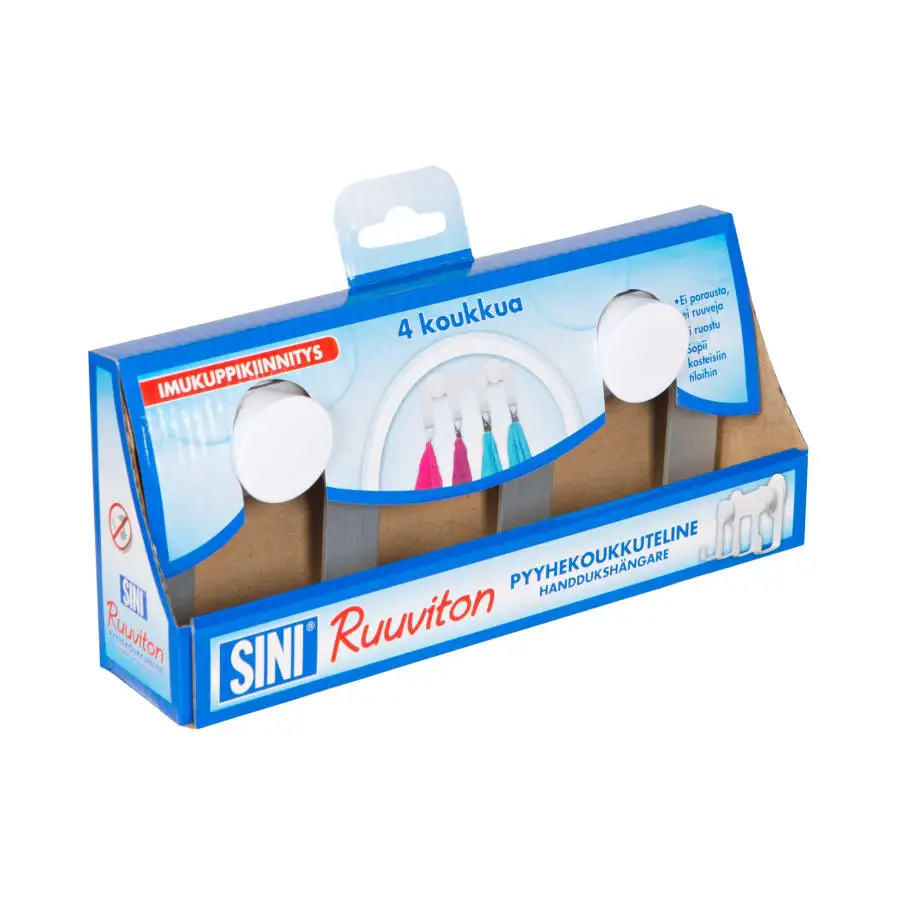 Den lätta och mångsidiga SINI skruvlösa handdukskrokhållaren är lämplig för badrum, kök och grovkök. Stativet fästs med sugkoppar på en slät kakel eller glasyta utan borrning eller skruvar. Fästet är baserat på en unik patenterad sugkopp omgiven av en lufttät och vattentät silikonring. Förutom handdukar kan en morgonrock hängas på handdukskrokhållaren. Bygg den mest passande helheten från de olika produkterna i Ruuvito-serien genom att kombinera olika delar som du vill!